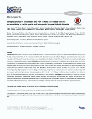 2019Seroprevalence of brucellosis and risk factors associated with its seropositivity in cattle, goats and humans in Iganga District, UgandaNguna, J.Dione, Michel M.Apamaku, M.Majalija, S.Mugizi, R.D.Odoch, T.Kato, C.D.Tumwine, G.Kabaasa, J.D.Curtis, K.Graham, M.Ejobi, F.Graham, T.