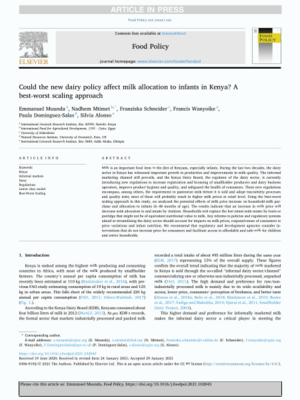 2021Could the new dairy policy affect milk allocation to infants in Kenya? A best-worst scaling approachMuunda, Emmanuel M.Mtimet, NadhemSchneider, F.Wanyoike, Francis N.Dominguez-Salas, PaulaAlonso, Silvia