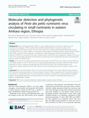 2019Molecular detection and phylogenetic analysis of Peste des petits ruminants virus circulating in small ruminants in eastern Amhara region, EthiopiaAlemu, Biruk G.Gari, GetachewLibeau, GenevieveKwiatek, OlivierKidane, MenbereBelayneh, RedietSiraw, BewuketWieland, BarbaraAsfaw, WondwosonAbdi, Reta D.
