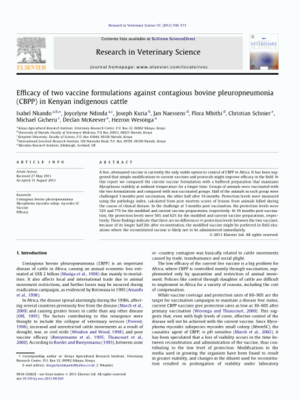 2012Efficacy of two vaccine formulations against contagious bovine pleuropneumonia (CBPP) in Kenyan indigenous cattleNkando, I.Ndinda, J.Kuria, J.Naessens, JanMbithi, F.Schnier, C.Gicheru, M.McKeever, Declan J.Wesonga, H.O.