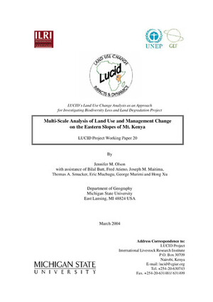 2003Multi-scale analysis of the root causes of land use and cover change in Embu and Mbeere Districts, KenyaOlson, J.F.Butt, B.Atieno, F.Maitima, J.Smucker, T.A.Muchugu, E.Murimi, G.Hong Xu