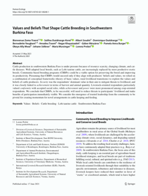 2021Values and beliefs that shape cattle breeding in southwestern Burkina FasoZoma‑Traoré, B.Ouédraogo-Koné, S.Soudré, A.Ouédraogo, D.Yougbaré, B.Traoré, A.Khayatzadeh, N.Mészáros, GáborBurger, P.A.Okeyo Mwai, AllySölkner, J.Wurzinger, MariaProbst, L.