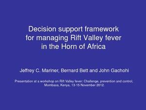 Mariner, J.C., Bett, B. and Gachohi, J. 2012. Decision support framework for managing Rift Valley fever in the Horn of Africa. Presented at a workshop on Rift Valley fever: Challenge, prevention and control, Mombasa, Kenya, 13-15 November 2012.