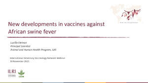 Steinaa, L. 2021. New developments in vaccines against African swine fever. Presented at an International Veterinary Vaccinology Network webinar, 30 November 2021. Nairobi, Kenya: ILRI.