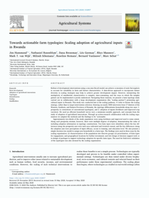 Hammond, J., Rosenblum, N., Breseman, D., Gorman, L., Manners, R., van Wijk, M.T., Sibomana, M., Remans, R., Vanlauwe, B. and Schute, M. 2020. Towards actionable farm typologies: Scaling adoption of agricultural inputs in Rwanda. Agricultural Systems 183:102857.