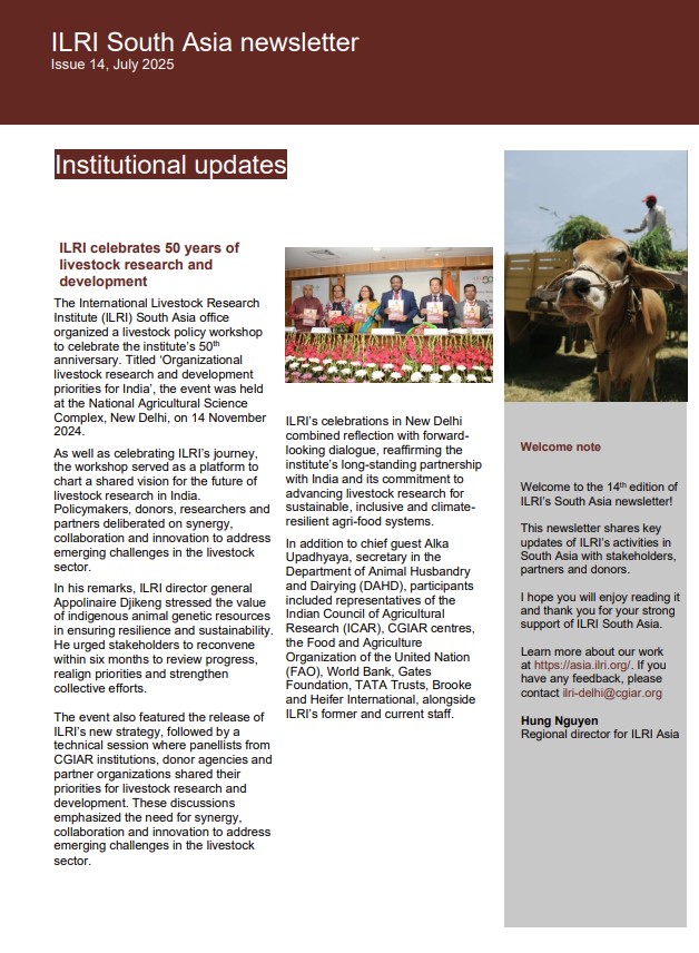 The fourteenth issue of the International Livestock Research Institute (ILRI) South Asia newsletter is now available. It provides an overview of the activities of this region from July 2024 to June 2025.