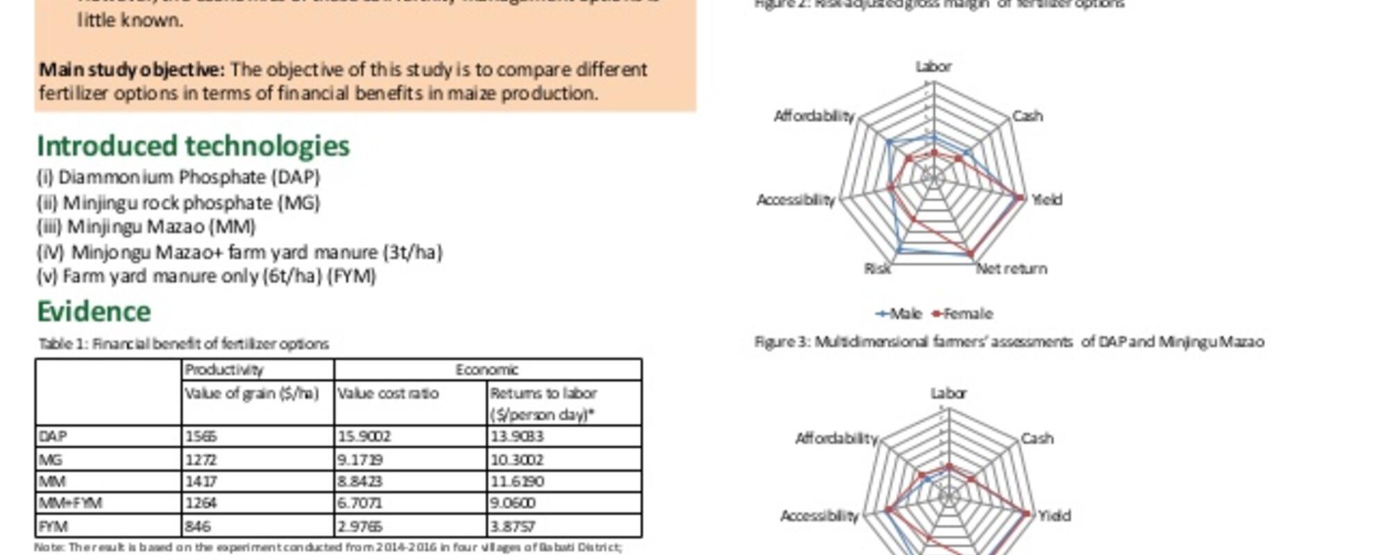 But the economics of these soil fertility management options is little known. This poster presents findings from study that assessed the economic feasibility of different fertilizer options namely: 1) Diammonium Phosphate (DAP); 2) Minjingu rock phosphate (MG); 3) Minjingu Mazao (MM); 4) Minjongu Mazao+farmyard manure (3t/ha); 5) Farmyard manure only (6t/ha) (FYM); 6) Farmers practice (no fertilizer).