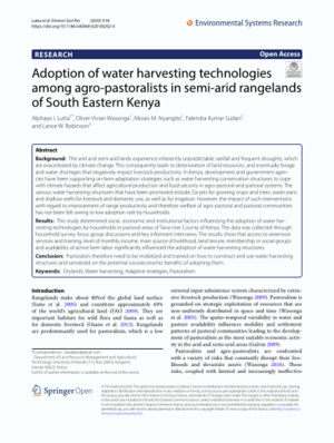 Lutta, Alphayo I.; Wasonga, Oliver Vivian; Nyangito, Moses M.; Sudan, Falendra Kumar; Robinson, Lance W. 2020. Adoption of water harvesting technologies among agro-pastoralists in semi-arid rangelands of South Eastern Kenya. Environmental Systems Research 9: