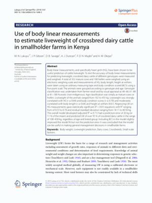 2016Use of body linear measurements to estimate liveweight of crossbred dairy cattle in smallholder farms in KenyaLukuyu, Margaret N.Gibson, John P.Savage, D.B.Duncan, Alan J.Mujibi, F.D.N.Okeyo Mwai, Ally
