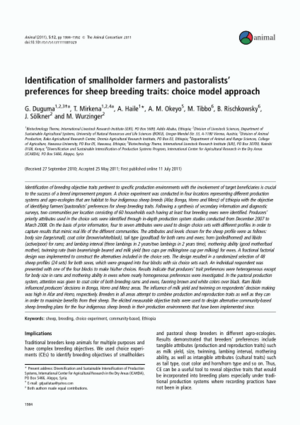 2011Identification of smallholder farmers and pastoralists’ preferences for sheep breeding traits: choice model approachDuguma, G.Mirkena, T.Haile, AynalemOkeyo Mwai, AllyTibbo, MarkosRischkowsky, Barbara A.Sölkner, JohannWurzinger, Maria
