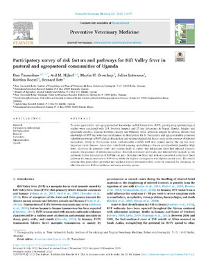 2023Participatory survey of risk factors and pathways for Rift Valley fever in pastoral and agropastoral communities of UgandaTumusiime, DanNijhof, A.M.Groschup, M.H.Lutwama, J.Roesel, KristinaBett, Bernard K.