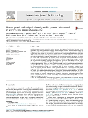 2016Limited genetic and antigenic diversity within parasite isolates used in a live vaccine against Theileria parvaHemmink, Johanneke D.Weir, W.MacHugh, Niall D.Graham, S.P.Patel, EktaPaxton, E.Shiels, B.Toye, Philip G.Morrison, W.I.Pelle, Roger