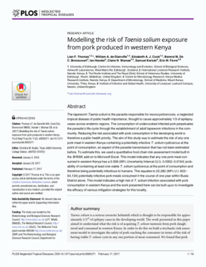 2017Modelling the risk of Taenia solium exposure from pork produced in western KenyaThomas, Lian F.Glanville, William A. deCook, Elizabeth A.J.Bronsvoort, B.M. de C.Handel, Ian G.Wamae, C.N.Kariuki, S.Fèvre, Eric M.