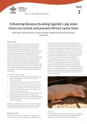 2017Enhancing biosecurity along Uganda’s pig value chains to control and prevent African swine feverDione, Michel M.Nantima, NoelinaMayega, L.Amia, Winfred C.Wieland, BarbaraOuma, Emily A.