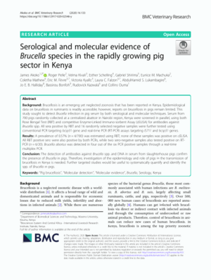 2020Serological and molecular evidence of Brucella species in the rapidly growing pig sector in KenyaAkoko, James M.Pelle, RogerKivali, VelmaSchelling, E.Shirima, G.Machuka, Eunice M.Mathew, C.Fèvre, Eric M.Kyallo, VictoriaFalzon, Laura C.Lukambagire, A.S.Halliday, J.E.B.Bonfoh, BassirouKazwala, R.Ouma, C.