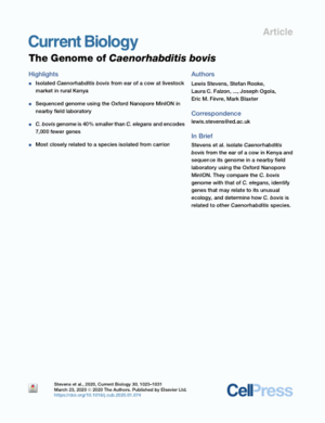 2020The genome of Caenorhabditis bovisStevens, L.Rooke, S.Falzon, Laura C.Machuka, Eunice M.Momanyi, Kelvin N.Murungi, Maurice K.Njoroge, Samuel M.Odinga, Christian O.Ogendo, A.Ogola, J.Fèvre, Eric M.Blaxter, M.