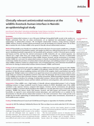 2019Clinically relevant antimicrobial resistance at the wildlife–livestock–human interface in Nairobi: An epidemiological studyHassell, James M.Ward, M.J.Muloi, Dishon M.Bettridge, Judy M.Robinson, Timothy P.Kariuki, S.Ogendo, A.Kiiru, J.Imboma, TitusKang'ethe, Erastus K.Öghren, E.M.Williams, N.J.Begon, M.Woolhouse, Mark E.J.Fèvre, Eric M.