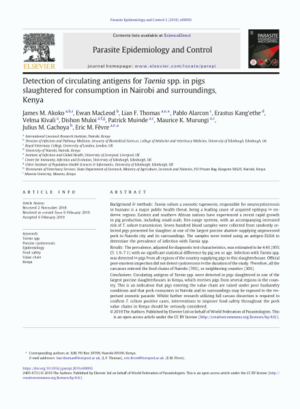 2019Detection of circulating antigens for Taenia spp. in pigs slaughtered for consumption in Nairobi and surroundings, KenyaAkoko, James M.Macleod, EwanThomas, Lian F.Alarcón, PabloKang'ethe, Erastus K.Kivali, VelmaMuloi, Dishon M.Muinde, PatrickMurungi, Maurice K.Gachoya, Julius M.Fèvre, Eric M.