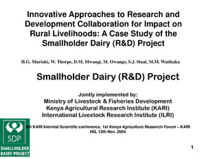 2004Innovative approaches to research and development collaboration for impact on rural livelihoods: a case study of the Smallholder Dairy (R&D) ProjectMuriuki, H.G.Thorpe, W.R.Mwangi, David MianoOwango, M.O.Staal, Steven J.Waithaka, M.M.