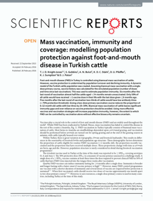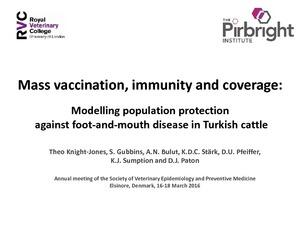 2016Mass vaccination, immunity and coverage: Modelling population protection against foot-and-mouth disease in Turkish cattleKnight-Jones, Theodore J.D.Gubbins, S.Bulut, A.N.Stärk, K.D.C.Pfeiffer, Dirk U.Paton, D.J.