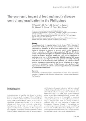 2002The economic impact of foot and mouth disease control and eradication in the PhilippinesRandolph, Thomas F.Perry, Brian D.Benigno, C.C.Santos , I.J.Agbayani, A.L.Coleman, P.Webb, R.Gleeson, L.J.