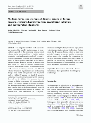 2019Medium-term seed storage of diverse genera of forage grasses, evidence-based genebank monitoring intervals, and regeneration standardsEllis, R.H.Nasehzadeh, M.Hanson, JeanNdiwa, Nicholas N.Woldemariam, Yeshi