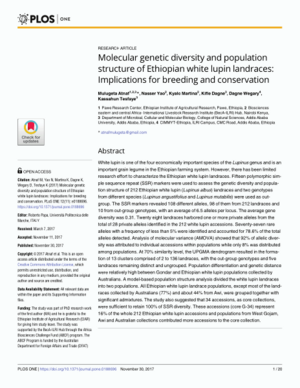 2017Molecular genetic diversity and population structure of Ethiopian white lupin landraces: Implications for breeding and conservationTiruneh, Mulugeta AtnafYao, N.Kyallo, Martina M.Dagne, K.Wegary, D.Tesfaye, K.