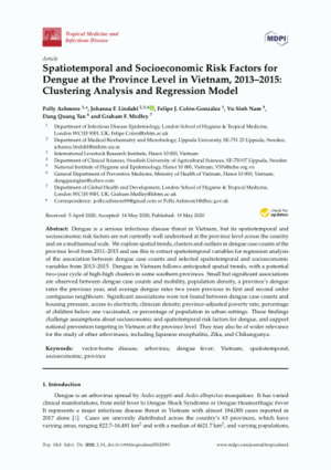 2020Spatiotemporal and socioeconomic risk factors for dengue at the province level in Vietnam, 2013–2015: Clustering analysis and regression modelAshmore, P.Lindahl, Johanna F.Colón-González, F.J.Vu Sinh NamDang Quang TanMedley, G.F.