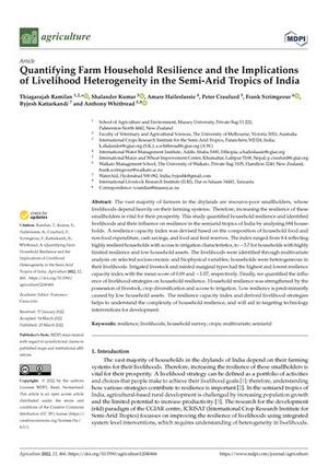 2022Quantifying farm household resilience and the implications of livelihood heterogeneity in the semi-arid tropics of IndiaRamilan, T.Kumar, S.Haileslassie, AmareCraufurd, Peter Q.Scrimgeour, F.Kattarkandi, B.Whitbread, Anthony M.