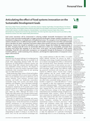 Herrero M, Thornton P, Mason-D'Croz D, Palmer J, Bodirsky BL, Pradhan P, Barrett CB, Benton TG, Hall A, Pikaar I, Bogard JR, Bonnett GD, Bryan BA, Campbell B, Christensen S, Clark M, Fanzo J, Godde CM, Jarvis A, Loboguerrero AM, Mathys A, McIntyre CL, Naylor RL, Nelson R, Obersteiner M, Parodi A, Popp A, Ricketts K, Smith P, Valin H, Vermeulen S, Vervoort J, van Wijk M, van Zanten HHE, West PC, Wood SA, Rockström J. 2021. Articulating the effect of food systems innovation on the Sustainable Development Goals. The Lancet Planetary Health 5:E50-E62.