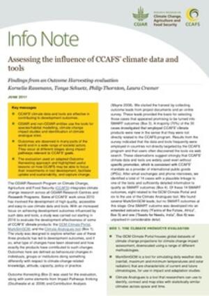 Rassmann K, Schuetz T, Thornton P, Cramer L, 2017. Assessing the influence of CCAFS’ climate data and tools, Findings from an Outcome Harvesting evaluation. CCAFS Info note. Wageningen, Netherlands: CGIAR Research Program on Climate Change, Agriculture and Food Security (CCAFS).
