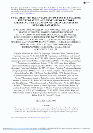 Farrow, A., Ronner, E., van den Brand, G., Boahen, S., Leonardo, W., Wolde-meskel, E., ... & Sangodele, E. (2016). From best fit technologies to best fit scaling: incorporating and evaluating factors affecting the adoption of grain legumes in Sub-Saharan Africa. Experimental Agriculture, 1-26.