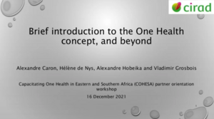 Caron, A., Nys, H. de, Hobeika, A. and Grosbois, V. 2021. Brief introduction to the One Health concept, and beyond. Presented at the Capacitating One Health in Eastern and Southern Africa (COHESA) partner orientation workshop, 16 December 2021. Paris, France: CIRAD.