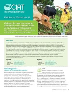 Charry A; Jäger M; Enciso K; Romero M; Sierra L; Quintero M; Hurtado JJ; Burkart S. 2018. Cadenas de valor con enfoque ambiental y cero deforestación en la Amazonía colombiana – Oportunidades y retos para el mejoramiento sostenible de la competitividad regional. CIAT Políticas en Síntesis No. 41. Centro Internacional de Agricultura Tropical (CIAT), Cali, Colombia. 10 p.