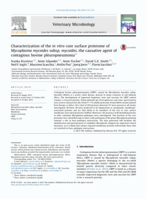 Krasteva, I., Liljander, A., Fischer, A., Smith, D.G.E., Inglis, N.F.I., Scacchia, M., Pini, A., Jores, J. and Sacchini, F. 2014. Characterization of the in vitro core surface proteome of Mycoplasma mycoides subsp. mycoides, the causative agent of contagious bovine pleuropneumonia. Veterinary Microbiology 168(1):116-123.