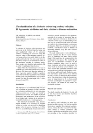 A collection of Sesbania sesban accessions was grown out in the field and classified using real and standardised values of 10 agronomic attributes. Clustering the accessions using the observed values of the attributes produced several groups which were mainly based on the dry matter yields after the first and second harvests. The cluster analysis on the standardised values of the descriptors provided 10 similarity groups. These groups were identified and compared with an earlier morphological classification. Some of the observed characters were used to establish their relationship with biomass yield of the trees. The data were therefore subjected to linear regression analysis. Predictive equations were obtained for the logarithmical transformed biomass yield using stem diameter at 30 cm from ground level plus the plant height with r to the square root of 2 values between 84 and 89 percent.