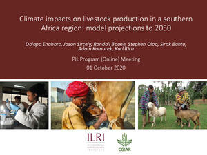 Enahoro, D.K., Sircely, J., Boone, R., Oloo, S., Bahta, S.T., Komarek, A. and Rich, K.M. 2020. Climate impacts on livestock production in a southern Africa region: Model projections to 2050. Presented during PIL Program (Online) Meeting, 1 October 2020. Nairobi, Kenya: ILRI.
