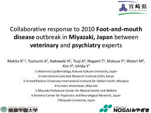 Makita, K., Tsutsumi, A., Kadowaki, H., Tsuji, A., Nogami, T., Matsuo, Y., Watari, M., Kim, Y. and Ishida, Y. 2012. Collaborative response to the 2010 foot and mouth disease outbreak in Miyazaki, Japan between veterinary and psychiatry experts. Presented at the 13th Conference of the International Society of Veterinary Epidemiology and Economics, Maastricht, The Netherlands, 20-24 August 2012. Nairobi, Kenya: ILRI.
