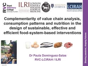 Dominguez-Salas, P., Häsler, B., Ferguson, E., Cornelsen, L., Alonso, S., Fèvre, E.M., Rushton, J., Grace, D. and Alarcon, P. 2015. Complementarity of value chain analysis, consumption patterns and nutrition in the design of sustainable, effective and efficient food-system-based interventions. Presentation at the 5th Leverhulme Centre for Integrative Research on Agriculture and Health (LCIRAH) Annual Research Conference, London, UK, 3-4 June 2015. Nairobi, Kenya: ILRI.