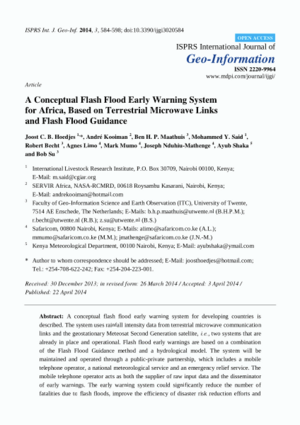 Hoedjes, J.C.B., Kooiman, A., Maathuis, B.H.P., Said, M.Y., Becht, R., Limo, A., Mumo, M., Nduhiu-Mathenge, J., Shaka, A. and Su, B. 2014. A conceptual flash flood early warning system for Africa, based on terrestrial microwave links and flash flood guidance. International Journal of Geo-Information. 3(2):584-598.