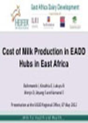 Baltenweck, I., Kinuthia, E., Lukuyu, B., Menjo, D., Atyang, S. and E. Kamanzi. 2012. Costs of milk production in EADD hubs in East Africa. Presented at the East Africa Dairy Development (EADD) Regional Office, Nairobi, Kenya, 7 May 2012. Nairobi: ILRI