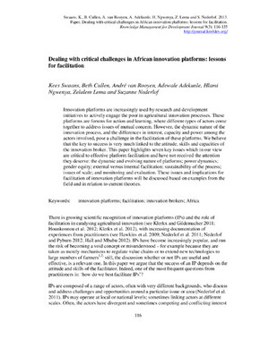 Swaans, K., Cullen, B., Rooyen, A. van, Adekunle, A., Ngwenya, H., Lema, Z. and Nederlof, S. 2013. Dealing with critical challenges in African innovation platforms: Lessons for facilitation. Knowledge Management for Development Journal 9(3):116-135.