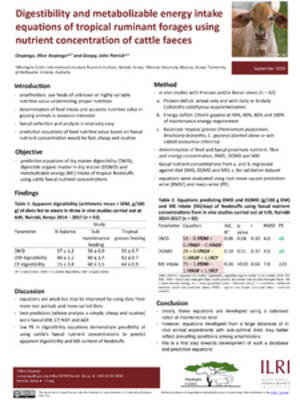 Onyango, A.A. and Goopy, J.P. 2020. Digestibility and metabolizable energy intake equations of tropical ruminant forages using nutrient concentration of cattle faeces. Poster prepared for the Tropentag 2020: Food and Nutrition Security and its Resilience to Global Crises, Virtual Conference, 9–11 September 2020. Nairobi, Kenya: ILRI.
