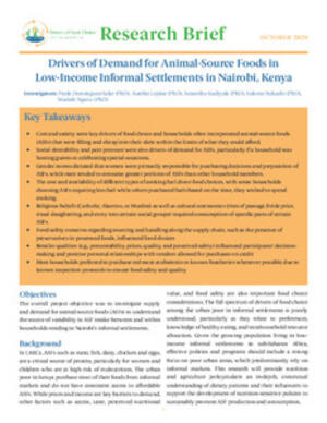 Dominguez-Salas, P., Lepine, A., Kadiyala, S., Bukachi, S. and Ngutu, M. 2020. Drivers of demand for animal-source foods in low-income informal settlements in Nairobi, Kenya. Drivers of Food Choice Research Brief. South Carolina, USA: University of South Carolina.