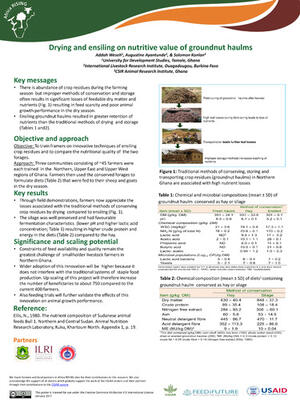 Weseh, A., Ayantunde, A. and Konlan, S. 2017. Drying and ensiling on nutritive value of groundnut haulms. Poster prepared for the Africa RISING West Africa Review and Planning Meeting, Accra, 1-2 February 2017. Tamale, Ghana: University for Development Studies.