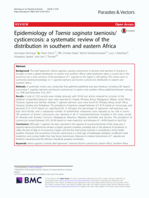 Dermauw, V., Dorny, P., Braae, U.C., Devleesschauwer, B., Robertson, L.J., Saratsis, A. and Thomas, L.F. 2018. Epidemiology of Taenia saginata taeniosis/cysticercosis: a systematic review of the distribution in southern and eastern Africa. Parasites and Vectors 11: 578.