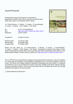 Ekine-Dzivenu, C.C., Mrode, R., Oyieng, E., Komwihangilo, D., Lyatuu, E., Msuta, G., Ojango, J.M.K. and Okeyo, A.M. 2020. Evaluating the impact of heat stress as measured by temperature-humidity index (THI) on test-day milk yield of small holder dairy cattle in a sub-Sahara African climate. Livestock Science 242:104314.