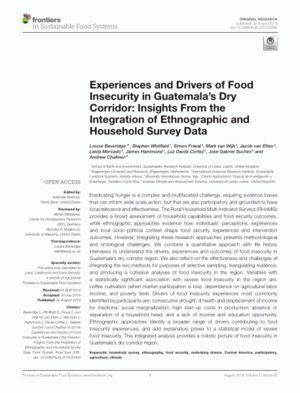 Beveridge, L.; Whitfield, S.; Fraval, S.; van Wijk, M.; van Etten, J.; Mercado, L.; Hammond, J.; Cortez, L.D.; Suchini, J.G.; Challinor, A. (2019) Experiences and drivers of food insecurity in Guatemala's dry corridor: insights from the integration of ethnographic and household survey data. Frontiers in Sustainable Food Systems, 3: Article 65. ISSN: 2571-581X