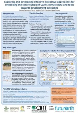 Rassmann K, Schuetz T, Thornton P, Cramer L. 2017. Exploring and developing effective evaluative approaches for evidencing the contribution of CCAFS climate data and tools towards development outcomes. Presented at the International Conference on Climate Change, Agriculture and Food Security - Where is the Cutting Edge? Galway, April 2017. Galway, Ireland: CGIAR Research Program on Climate Change, Agriculture and Food Security (CCAFS).