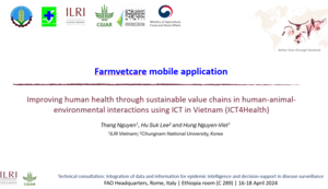 Thang Nguyen, Hu Suk Lee and Hung Nguyen-Viet. 2024. Farmvetcare mobile application. Presentation at a technical consultation on integration of data and information for epidemic intelligence and decision-support in disease surveillance, Rome, Italy, 16–18 April 2024. Nairobi, Kenya: ILRI.